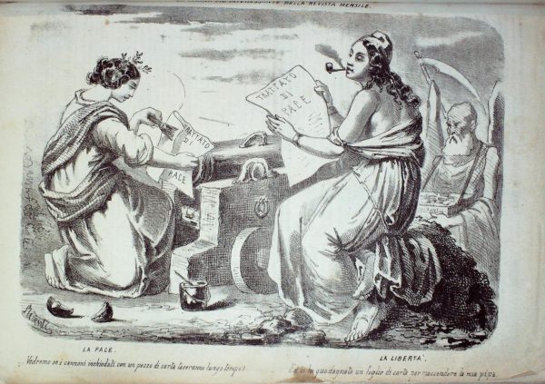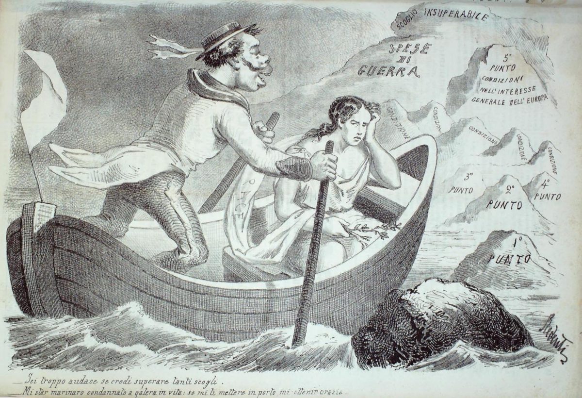 La figura femminile della Pace si trova su una barca a remi condotta da un austriaco verso degli scogli, che rappresentano le condizioni della fine delle ostilità. In calce: “Sei troppo audace se credi superare tali scogli. – Mi star marinaro condannato a galera in vita: se mi ti mettere in porto mi ottener grazia”.