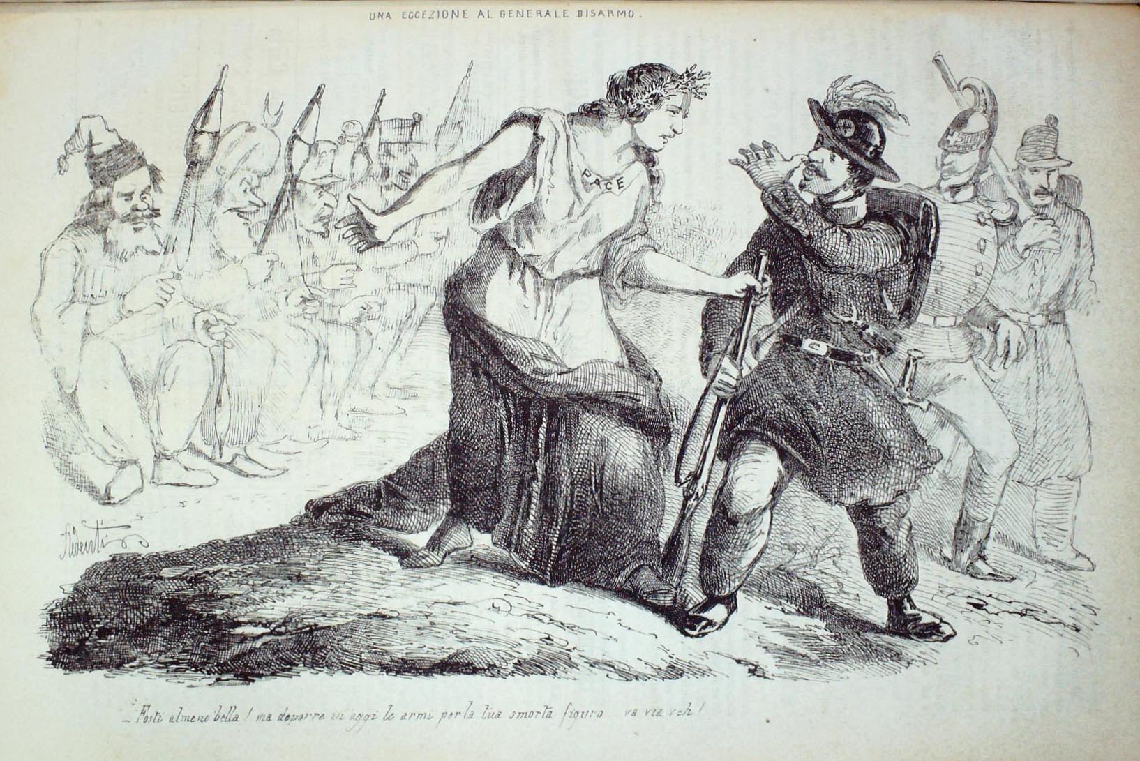 Un bersagliere piemontese si prende gioco della figura femminile della Pace. Il riferimento è al Congresso di Parigi. Sullo fondo soldati, russi, turchi, francesi e inglesi. In calce: “Fosti almeno bella! Ma deporre in oggi le armi per la tua smorta figura … va via veh!”.