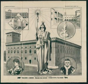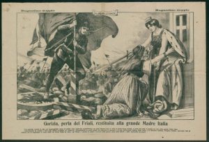 L’Italia turrita è ritratta nell’atto di forgiare una vittoria alata; Guglielmo II e i suoi alleati assistono alla scena. In testa al manifesto: Rugantino Doppio; in calce: “Con rapidità energica ed ordinata, che ha del miracoloso, l’Italia ha saputo creare nuove industrie per la guerra, impiantare officine, disciplinare una maestranza tecnica composta di circa mezzo milione di operai. Essi preparano le armi per la vittoria”.