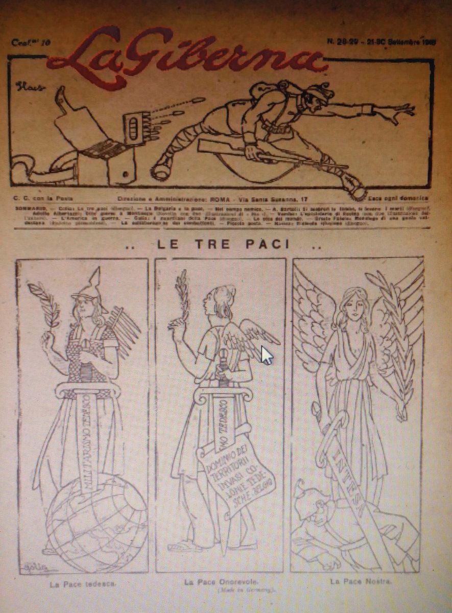 Tre sono le tipologie di pace rappresentate sulla copertina del giornale di trincea: l’allegoria femminile della “Pace tedesca”, con pick helm, corazza e la spada del “militarismo”; l’allegoria femminile della “Pace onorevole”, sempre di matrice tedesca, che nasconde dietro la schiena la spada del “militarismo” e un volantino con su scritto “dominio dei territori invasi-colonie tedesche -Belgio”; e l’allegoria femminile della “Pace Nostra” che, con la spada dell'”Intesa”, abbatte un soldato tedesco.
